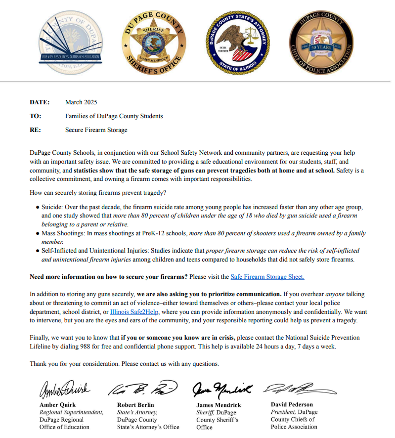One of her first priorities as a DuPage County Board member was to get her school district to start sharing a message about secure firearm storage with parents and guardians. The answer was still a “no.” But this time, Yeena, as a County Board member, went to the regional office of education in DuPage County, which oversaw all school districts. And after coordinating with officials and offices across the county, Yeena succeeded in issuing the message about secure storage to families across the county.